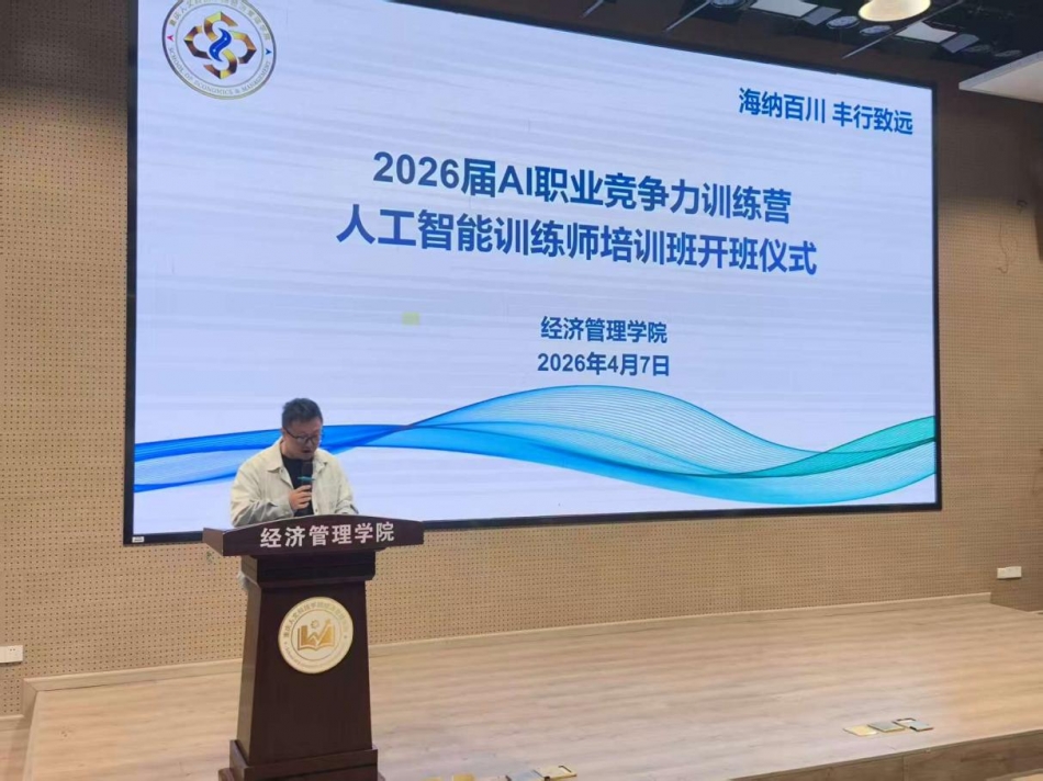 为抢抓人工智能产业发展机遇,精准赋能学生职业成长,切实提升2026届毕业生在AI时代的就业竞争力,学院于2026年4月7日隆重举行AI职业竞争力训练营人工智能训练师培训班开班仪式。学校培训与继续教育学院副院长刘翔、重庆市合川区海诺职业技术培训学校校长朱红林、学院党总支书记黄代蓥、党总支副书记张倩,全体毕业年级辅导员及参训学员出席本次活动。